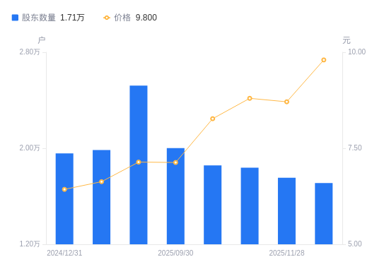 近一年(2024年12月31日至2025年12月10日),郴电国际A股股东户数从1.96万户,减低至1.71万户,降幅12.64%,区间股价上涨49.62%。