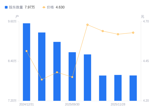 近一年(2024年12月31日至2025年12月10日),康恩贝A股股东户数从9.55万户,减低至7.97万户,降幅16.56%,区间股价上涨1.00%。