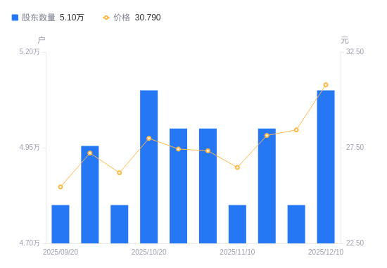 近一年(2024年12月10日至2025年12月10日),中颖电子A股股东户数从5.3万户,减低至5.1万户,降幅3.77%,区间股价上涨18.15%。