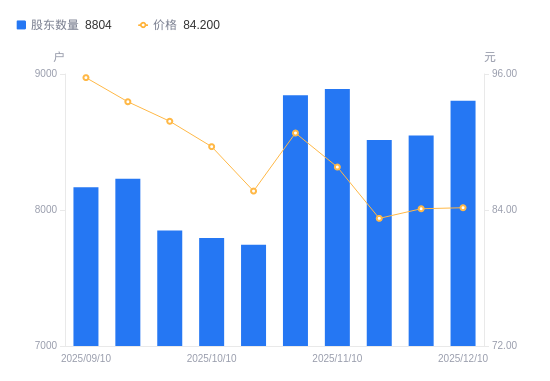 近一年(2024年12月20日至2025年12月10日),博实结A股股东户数从1.51万户,减低至8804户,降幅41.71%,区间股价上涨19.03%。