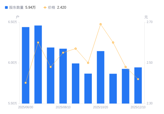 近一年(2024年12月20日至2025年12月10日),甘肃能化A股股东户数从6.97万户,减低至5.94万户,降幅14.72%,区间股价下跌12.70%。