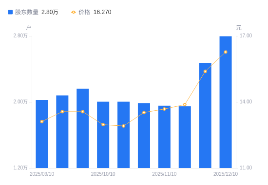近一年(2024年12月10日至2025年12月10日),光莆股份A股股东户数从1.82万户,增加至2.8万户,增幅53.30%,区间股价上涨13.80%。