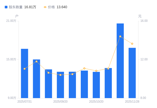 近一年(2024年11月29日至2025年11月28日),雪人集团A股股东户数从9.48万户,增加至16.81万户,增幅77.45%,区间股价上涨90.24%。