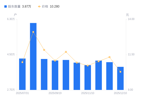 近一年(2024年12月20日至2025年12月10日),金现代A股股东户数从3.82万户,增加至3.87万户,增幅1.43%,区间股价上涨6.02%。