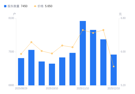 近一年(2024年12月20日至2025年12月10日),*ST天龙A股股东户数从7846户,减低至7450户,降幅5.05%,区间股价上涨7.62%。