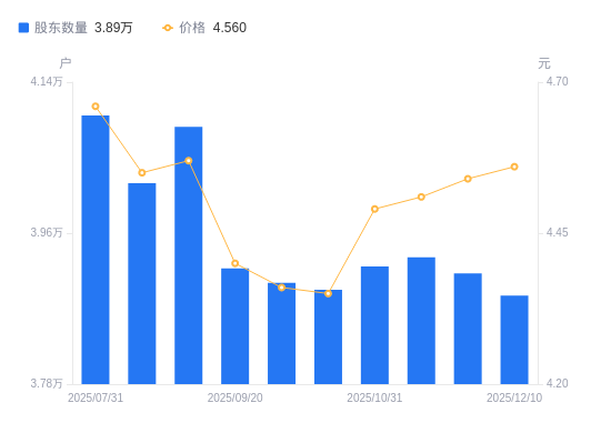 近一年(2024年12月20日至2025年12月10日),福安药业A股股东户数从4.22万户,减低至3.89万户,降幅7.83%,区间股价下跌2.77%。