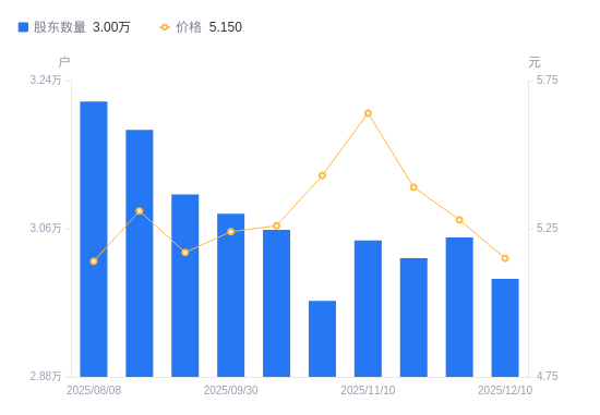 近一年(2024年12月10日至2025年12月10日),德联集团A股股东户数从3.25万户,减低至3万户,降幅7.67%,区间股价上涨5.75%。