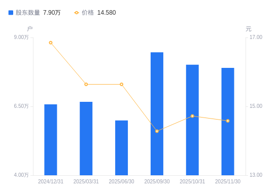 近一年(2024年12月31日至2025年11月30日),川投能源A股股东户数从6.57万户,增加至7.9万户,增幅20.16%,区间股价下跌12.64%。