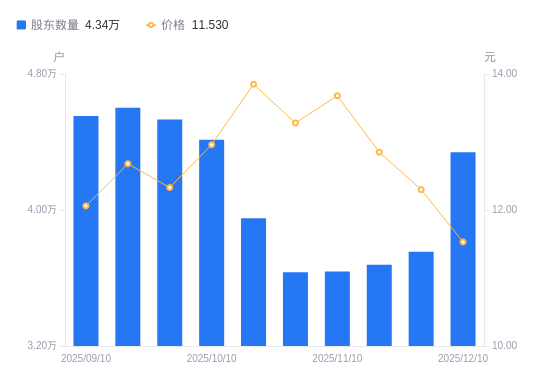 近一年(2024年12月20日至2025年12月10日),淮北矿业A股股东户数从4.86万户,减低至4.34万户,降幅10.76%,区间股价下跌13.44%。