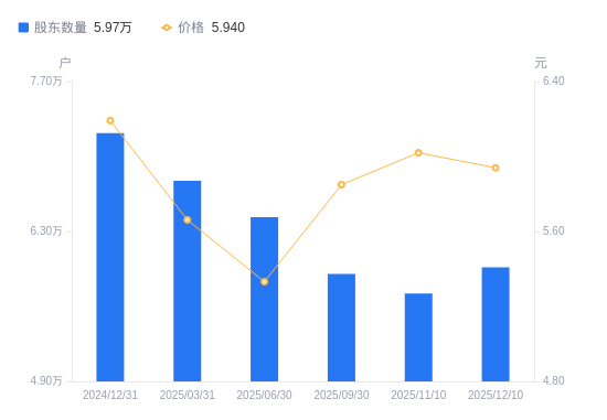 近一年(2024年12月31日至2025年12月10日),苏州高新A股股东户数从7.22万户,减低至5.97万户,降幅17.37%,区间股价下跌10.16%。