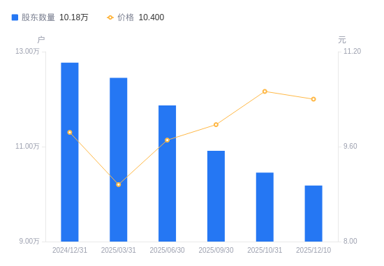 近一年(2024年12月31日至2025年12月10日),浙江龙盛A股股东户数从12.77万户,减低至10.18万户,降幅20.25%,区间股价上涨2.97%。