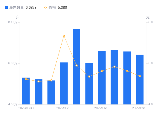 近一年(2024年12月20日至2025年12月10日),云南旅游A股股东户数从5.16万户,增加至6.68万户,增幅29.65%,区间股价下跌8.81%。