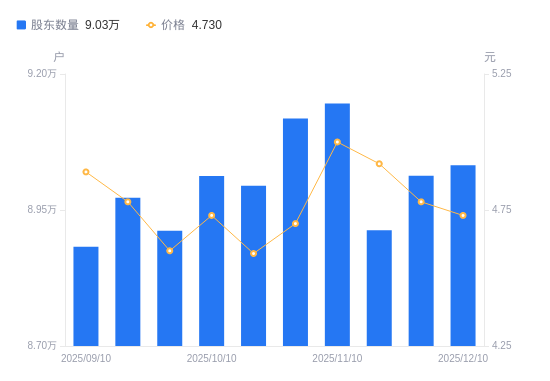 近一年(2024年12月10日至2025年12月10日),中泰化学A股股东户数从8.9万户,增加至9.03万户,增幅1.43%,区间股价上涨2.83%。