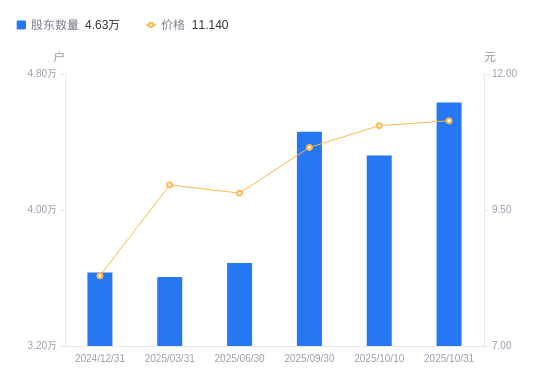 近一年(2024年12月31日至2025年10月10日),芭田股份A股股东户数从3.63万户,增加至4.32万户,增幅18.95%,区间股价上涨31.24%。