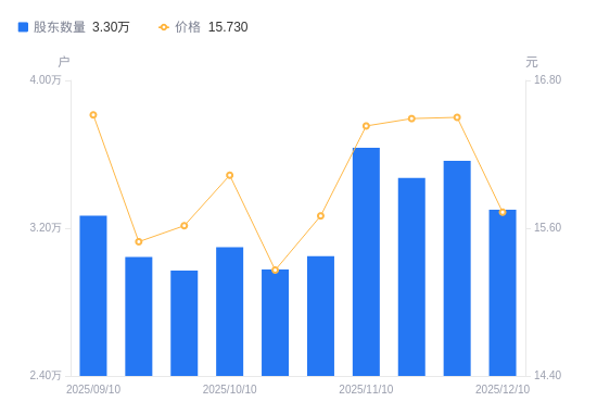 12月15日消息,数据显示,截至2025年12月10日,国瑞科技A股股东总户数为3.3万户,较上期(2025年11月28日)减少2643户,降幅7.41%。公司最新A股总股本为2.94亿股,其中流通A股2.94亿股,户均持有流通A股数量为8914.85股,较上期增加660.96股,增幅8.01%;户均持流通A股市值14.02万元,较上期增加4041.43元,增幅2.97%。