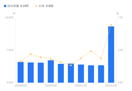 近一年(2024年12月10日至2025年12月10日),双星新材A股股东户数从6.43万户,增加至9.19万户,增幅42.92%,区间股价上涨11.41%。