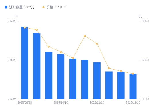 近一年(2024年12月10日至2025年12月10日),通达动力A股股东户数从3.51万户,减低至2.82万户,降幅19.56%,区间股价上涨14.70%。