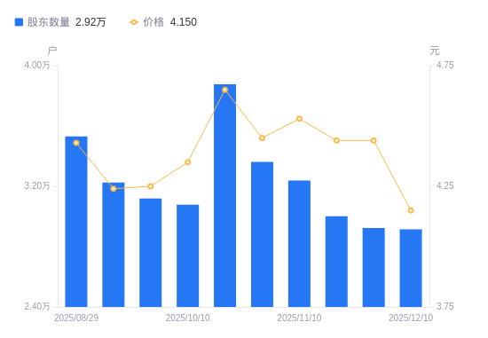 近一年(2024年12月31日至2025年12月10日),文科股份A股股东户数从2.03万户,增加至2.92万户,增幅43.52%,区间股价上涨18.57%。
