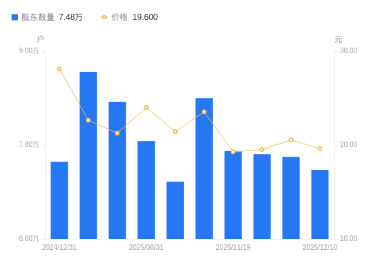 近一年(2024年12月31日至2025年12月10日),润欣科技A股股东户数从7.58万户,减低至7.48万户,降幅1.35%,区间股价下跌30.24%。