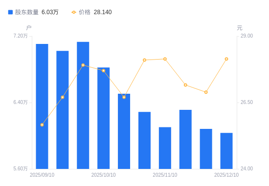 近一年(2024年12月10日至2025年12月10日),德赛电池A股股东户数从6.75万户,减低至6.03万户,降幅10.65%,区间股价上涨14.62%。