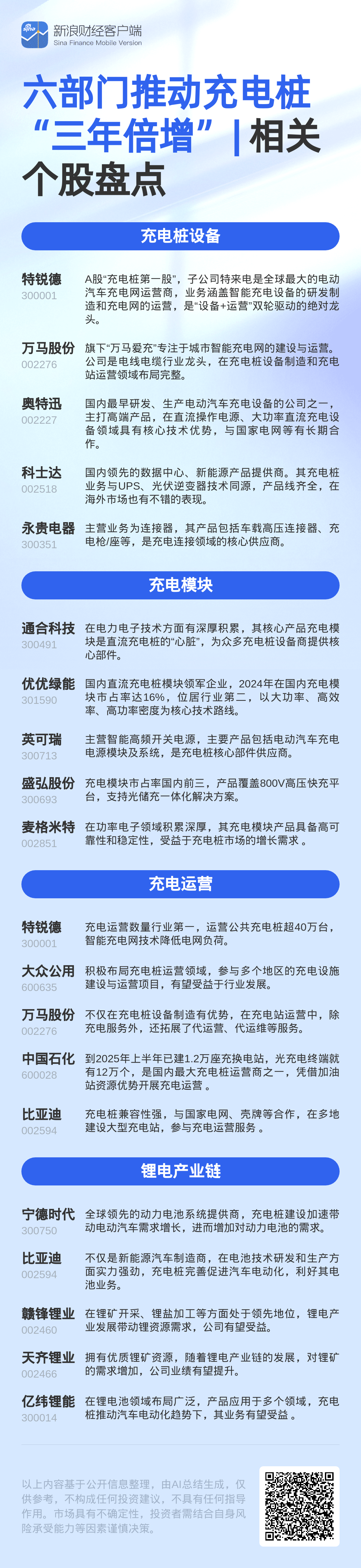 国家发改委等六部门印发《电动汽车充电设施服务能力“三年倍增”行动方案(2025—2027年)》。到27年底要建成2800万个充电设施,提供超3亿千瓦公共充电容量,满足超8000万辆电动汽车需求。