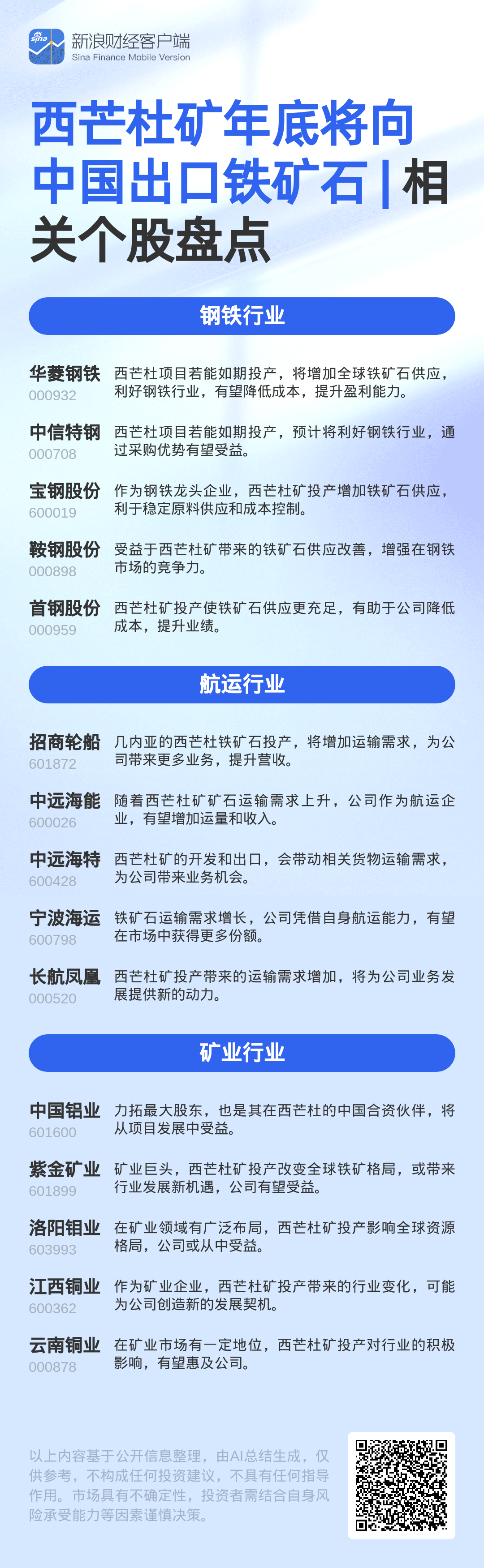 上个月新铁路投运,计划年底出口矿石到中国。项目总投资230亿美元,力拓与中企赢联盟控股公司合资开发。首批货物本月装船,年底运出约20万吨,力拓矿区计划30个月内提产至每年6000万吨,两者合计约占2024年全球产量5%。