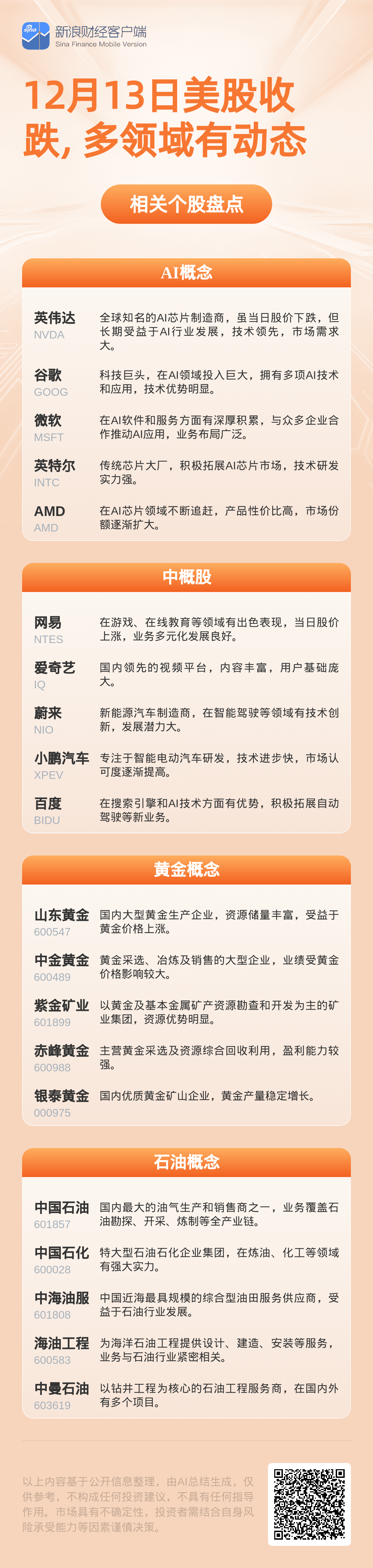 12月13日美股收跌,纳指下跌400点,AI个股普跌,博通股价创10个月来最大跌幅,热门中概股涨跌不一,网易涨2.11%,台积电跌4.17%。周五国际油价因供应过剩担忧小幅走低,现货黄金涨0.53%,本周累涨约2.5%,欧洲股市从创纪录高点附近回落。特朗普将沃什和哈塞特列为美联储主席候选人,美一些州将起诉其天价H - 1B签证申请费。此外还涉及企业动态,如甲骨文数据中心完工期推迟等。美联储官员言论分歧明显,美银称10年期美债收益率或走低,大宗商品有涨有跌,美股脱离纪录高位。 (AI生成)