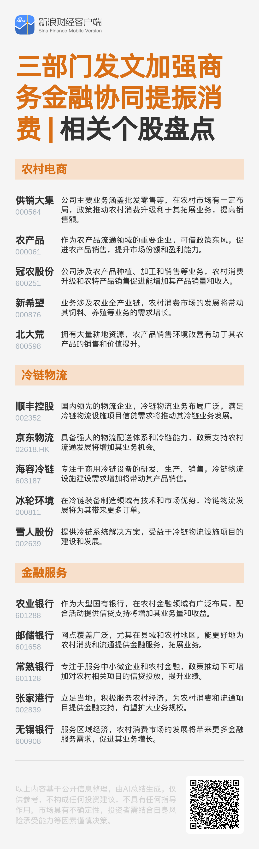 商务部办公厅等三部门发布《关于加强商务和金融协同 更大力度提振消费的通知》,提出扩大县域消费,为相关活动提供信贷支持;升级农村消费,提供特色金融服务;支持农村流通发展,满足融资及信贷需求。