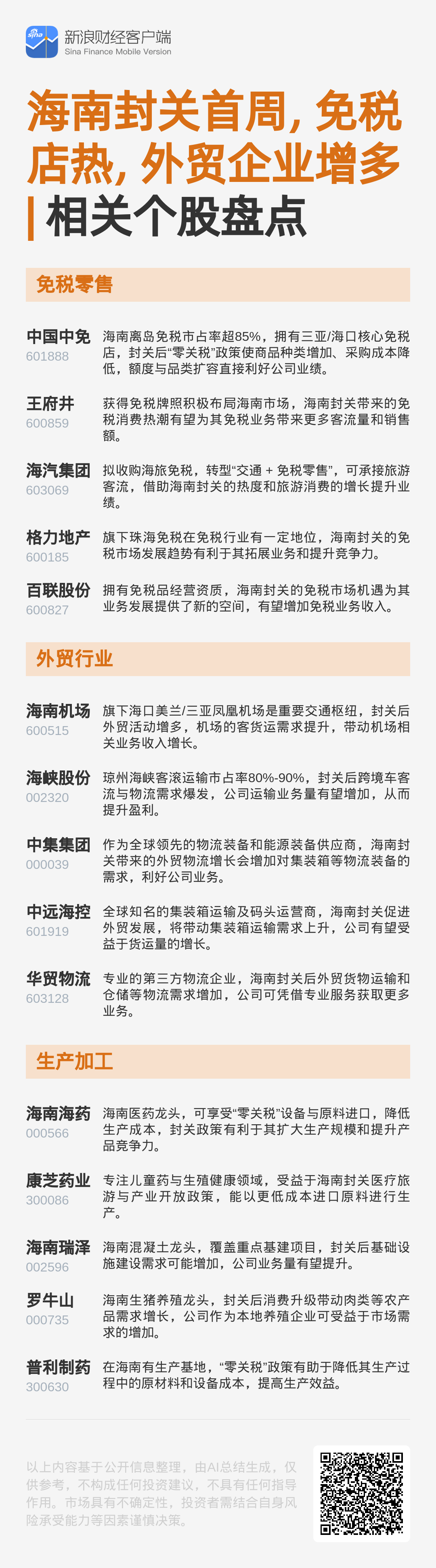 封关六天三亚四家免税店销售额达 6.3 亿元,同比增长 47.2%。海南封关利好生产加工类企业,首周新增外贸备案企业 1972 家,同比增 2.3 倍。免税店销售趋火,封关首日进店客流、销售额同比大幅增长,同时有关部门严防“套代购”走私。