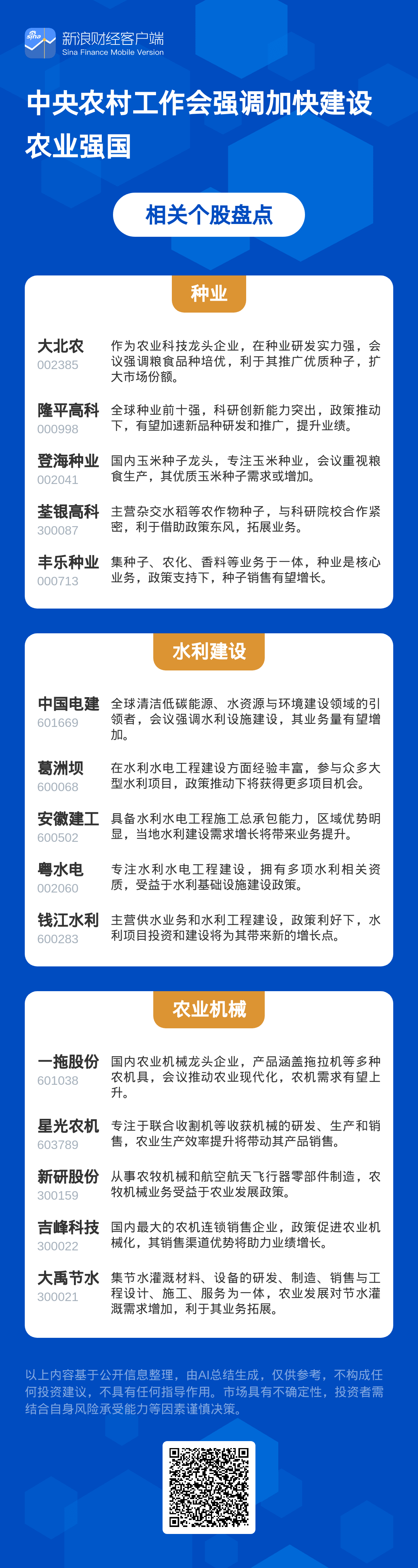 29日至30日,中央农村工作会议在北京召开。会议指出,农业农村现代化关乎中国式现代化全局,要加快建设农业强国。稳定粮油生产,实施新一轮千亿斤粮食产能提升行动;加强水利等建设,增强防灾减灾能力;提升“菜篮子”品质和多元化食物供给能力;推进高标准农田建设,发展农业新质生产力。巩固拓展脱贫成果,促进农民增收。完善乡村建设机制,补齐短板,整治环境。推进农村基层建设,维护稳定。深化农村改革,开展第二轮土地承包到期后再延三十年整省试点,增添乡村发展活力。