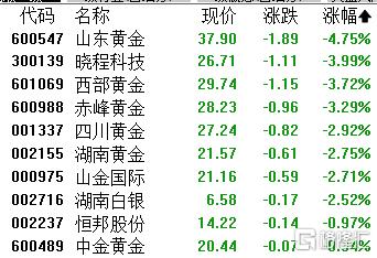 贵金属板块下挫,山东黄金跌超4%,晓程科技、西部黄金、赤峰黄金、四川黄金、湖南黄金等跟跌。