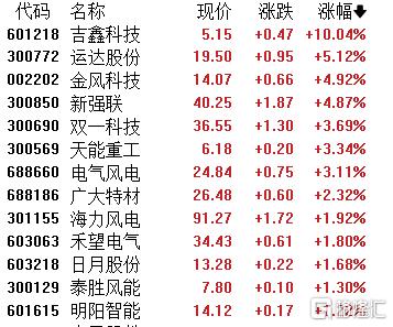 风电设备板块涨幅居前,吉鑫科技涨停,运达股份、金风科技、新强联、双一科技、天能重工、电气风电、广大特材等跟涨。