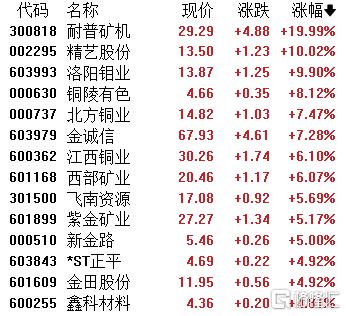 铜、工业金属板块活跃,耐普矿机20CM涨停,精艺股份、洛阳钼业涨停,铜陵有色、北方铜业、江西铜业、西部矿业等跟涨。