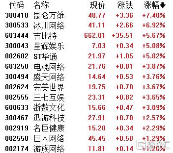 游戏板块走高,昆仑万维大涨超7%,冰川网络、吉比特、星辉娱乐、电魂网络、盛天网络、完美世界等跟涨。