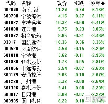 另外,贵金属板块走低,山东黄金领跌;港口航运板块走低,南京港、宁波海运跌超6%;燃气股、工程机械、油气开采及服务、物流、房地产等板块跌幅居前。