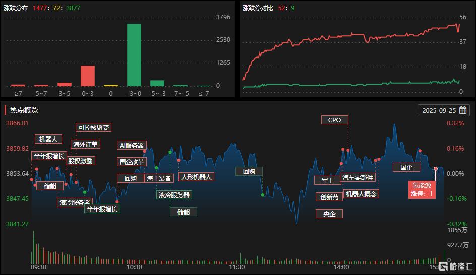 9月25日,A股主要指数涨跌不一,沪指跌0.01%报3853点,深证成指涨0.67%,创业板指涨1.58%创三年多新高。