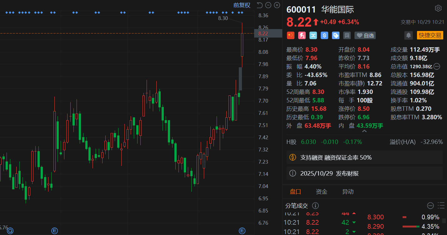 格隆汇10月29日|受业绩影响,华能国际(600011.SH)今日跳空高开,盘初一度涨超7%,高见8.3元创14个月新高,总市值1292亿元。消息上,华能国际第三季度营收为609.43亿元,同比下降7.09%;净利润为55.79亿元,同比增长88.54%。前三季度营收为1729.75亿元,同比下降6.19%;净利润为148.41亿元,同比增长42.52%。业绩增长主要由于境内燃料成本同比下降。此外,公司日前发行了今年第十期超短期融资券,筹集30亿元人民币用于支持营运资金和偿还债务。(格隆汇)