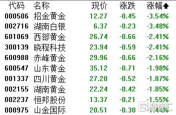 贵金属板块下挫,招金黄金、湖南白银跌超3%,西部黄金、晓程科技、赤峰黄金、山东黄金、四川黄金等跟跌。