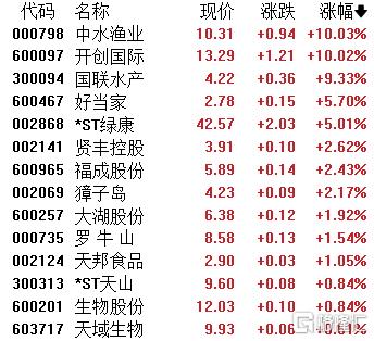 养殖业板块活跃,中水渔业、开创国际涨停,国联水产、好当家、贤丰控股(维权)、福成股份、獐子岛等跟涨。