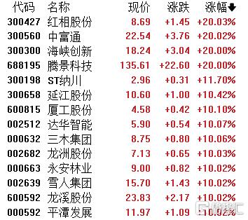 福建及自贸区板块掀涨停潮,红相股份、中富通、海峡创新、腾景科技20CM涨停,厦工股份、达华智能(维权)、三木集团等十多只个股涨停。