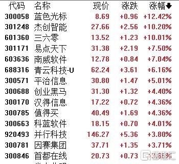 AI应用概念拉升,蓝色光标涨超12%,杰创智能、三六零涨停,易点天下、南威软件、青云科技、创业黑马等跟涨。