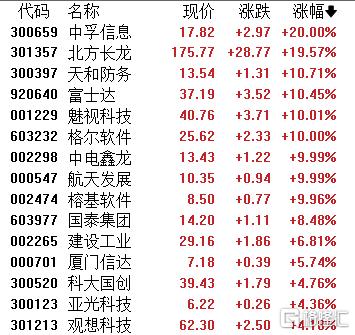 军工装备、军工信息化板块强势,中孚信息20cm涨停,魅视科技、格尔软件、中电鑫龙、航天发展、榕基软件涨停。