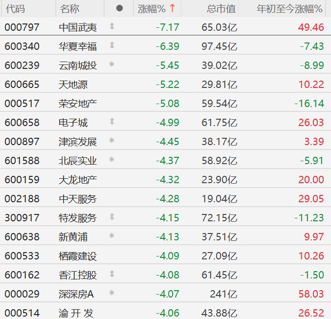 格隆汇12月11日|昨日盘中一度集体拉升的房地产股今日重回跌势,截至半日收盘,中国武夷跌超7%,华夏幸福跌超6%,云南城投、天地源、荣安地产跌超5%,津滨发展、北辰实业、大龙地产、中天服务、特发服务、新黄浦、栖霞建设、香江控股、深深房A、渝开发跌超4%,万科A跌近3%。