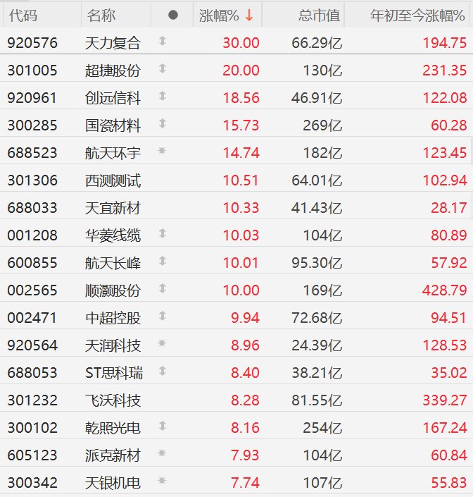 格隆汇12月12日|A股市场商业航天股再度集体爆发,其中,天力复合30CM涨停,超捷股份20CM涨停,创远信科涨超18%,国瓷材料涨超15%,航天环宇涨近15%,西测测试、天宜新材(维权)涨超10%,华菱线缆、航天长峰、顺灏股份、中超控股10CM涨停,天润科技、飞沃科技、乾照光电涨超8%,派克新材、天银机电涨超7%。
