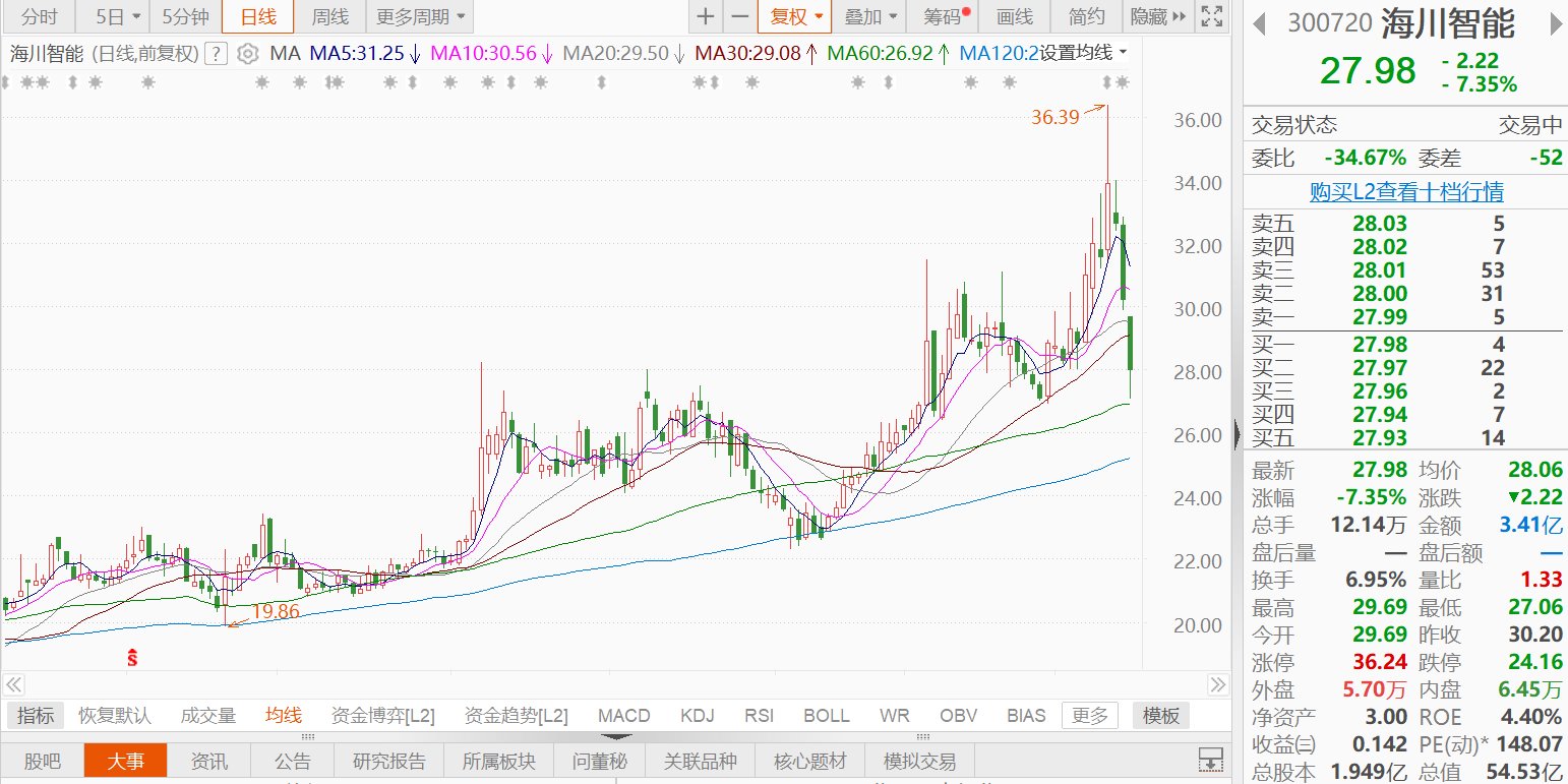 格隆汇12月15日|海川智能(300720.SZ)一度跌近10%,现跌7.35%报27.98元,总市值54.53亿元。海川智能公告称,持股3.13%的股东吴桂芳计划减持不超过584.63万股(占总股本的3.00%),持股2.98%的股东郑雪芬计划减持不超过581.59万股(占总股本的2.98%),减持方式为集中竞价或大宗交易,减持原因为个人资金需求,减持期间为公告披露之日起15个交易日后的3个月内(2026年1月7日至2026年4月6日)。(格隆汇)