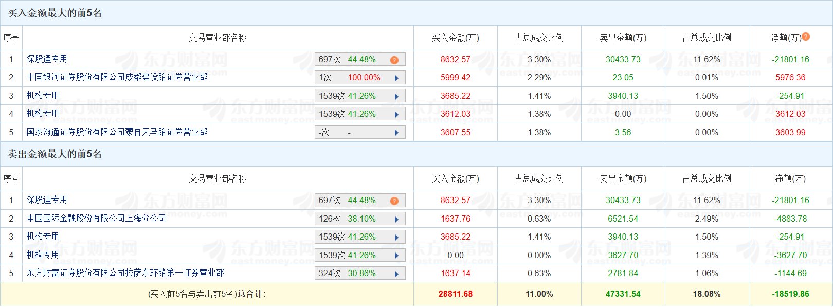 恩捷股份(002812.SZ)今日跌停,换手率6.24%,成交额26.18亿元。龙虎榜数据显示,深股通买入8632万元,卖出3.04亿元,净卖出2.18亿元;游资“量化基金”位列卖二席位,净卖出4884万元。上榜席位全天买入2.88亿元,卖出4.73亿元,合计净卖出1.85亿元。(格隆汇)