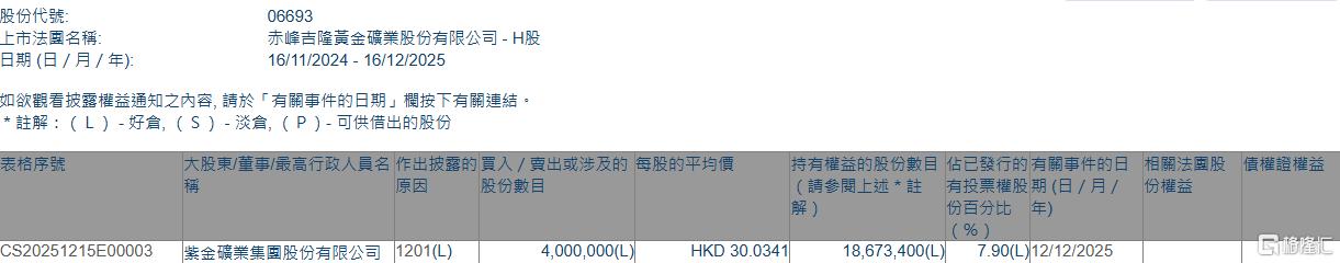 格隆汇12月16日丨根据联交所最新权益披露资料显示,2025年12月12日,赤峰黄金(06693.HK)遭紫金矿业集团股份有限公司在场内以每股均价30.0341港元减持400万股,涉资约1.20亿港元。