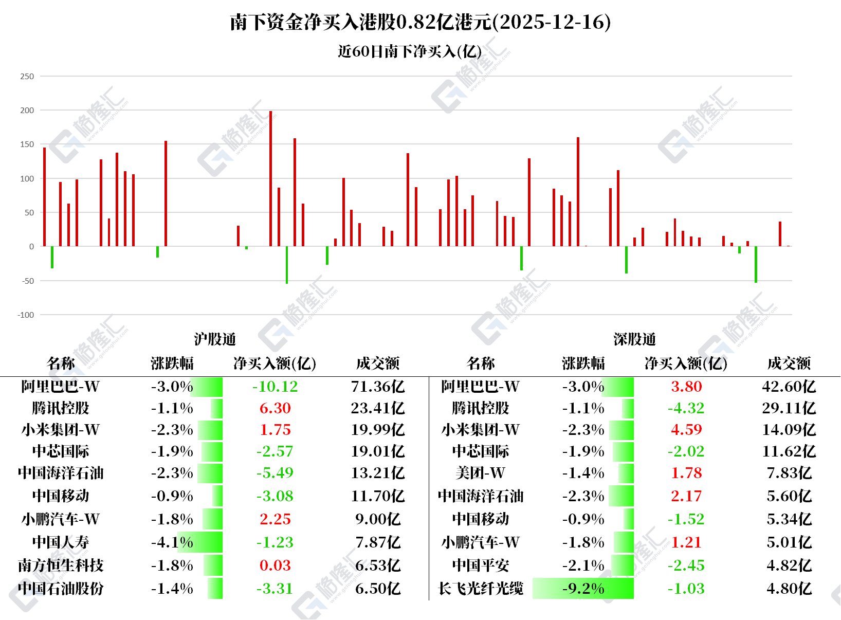 格隆汇12月16日|南下资金今日净买入港股8202.9万港元。其中: