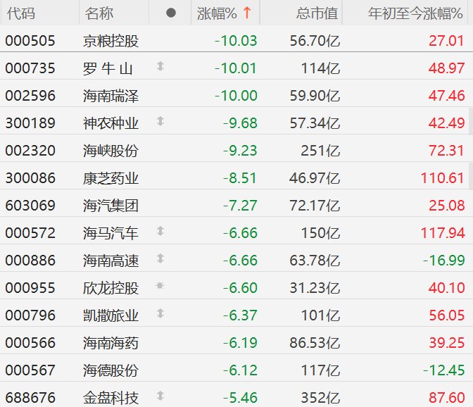 格隆汇12月17日|A股市场海南概念股集体下挫,其中,京粮控股、罗牛山、海南瑞泽跌停,神农种业、海峡股份跌超9%,康芝药业跌超8%,海汽集团跌超7%,海马汽车、海南高速、欣龙控股、凯撒旅业(维权)、海南海药(维权)、海德股份(维权)跌超6%,金盘科技跌超5%。