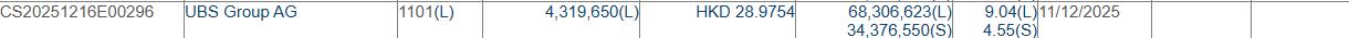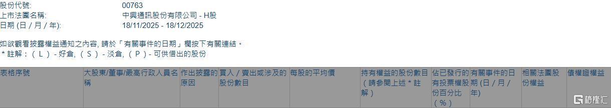 格隆汇12月18日丨根据联交所最新权益披露资料显示,2025年12月11日,中兴通讯(00763.HK)获UBS Group AG在场内以每股均价28.9754港元增持好仓431.965万股,涉资约1.25亿港元。